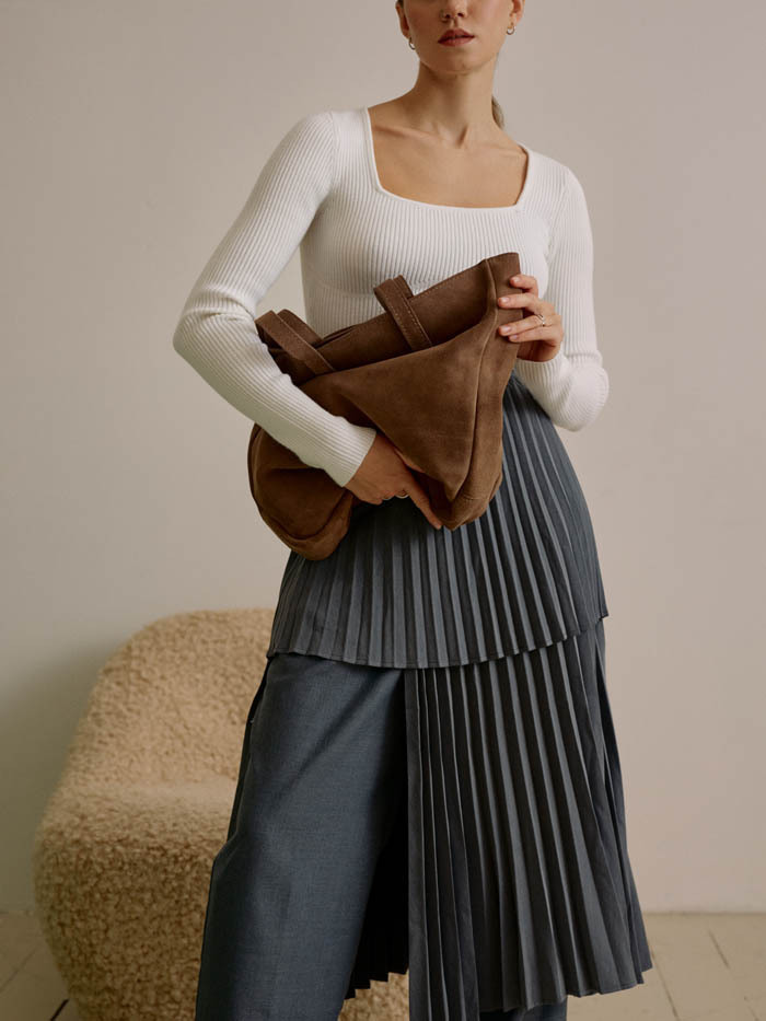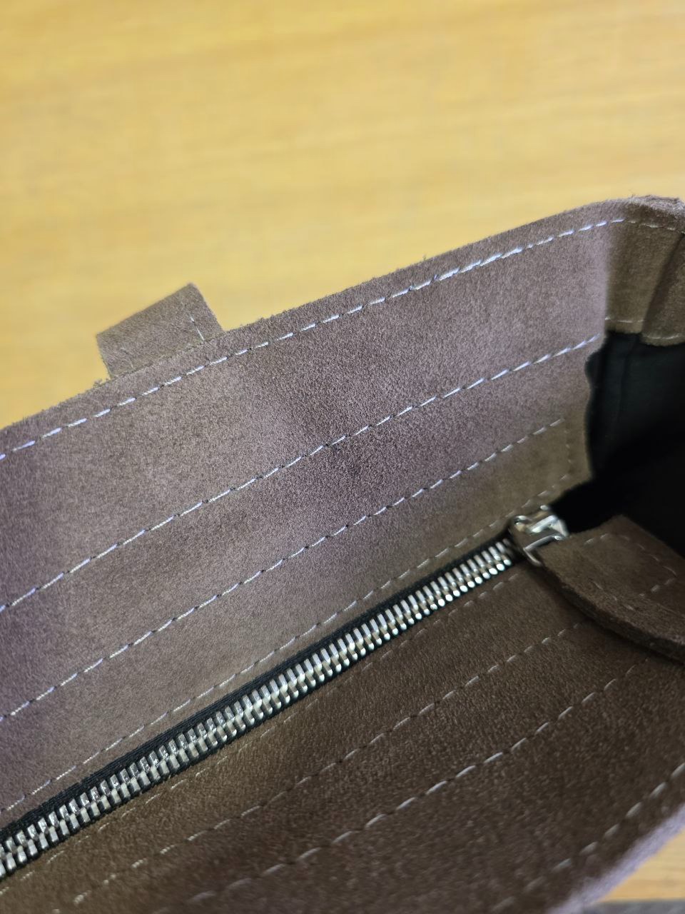 Этот шоппер насыщенного цвета. Не рекомендуем носить его со светлой одеждой в первую неделю. Излишки красителя будут выделяться на первых порах носки, поэтому замша может окрашивать светлую одежду. Чтобы свести этот эффект к минимуму рекомендуем использовать аэрозольную пропитку для замши.
