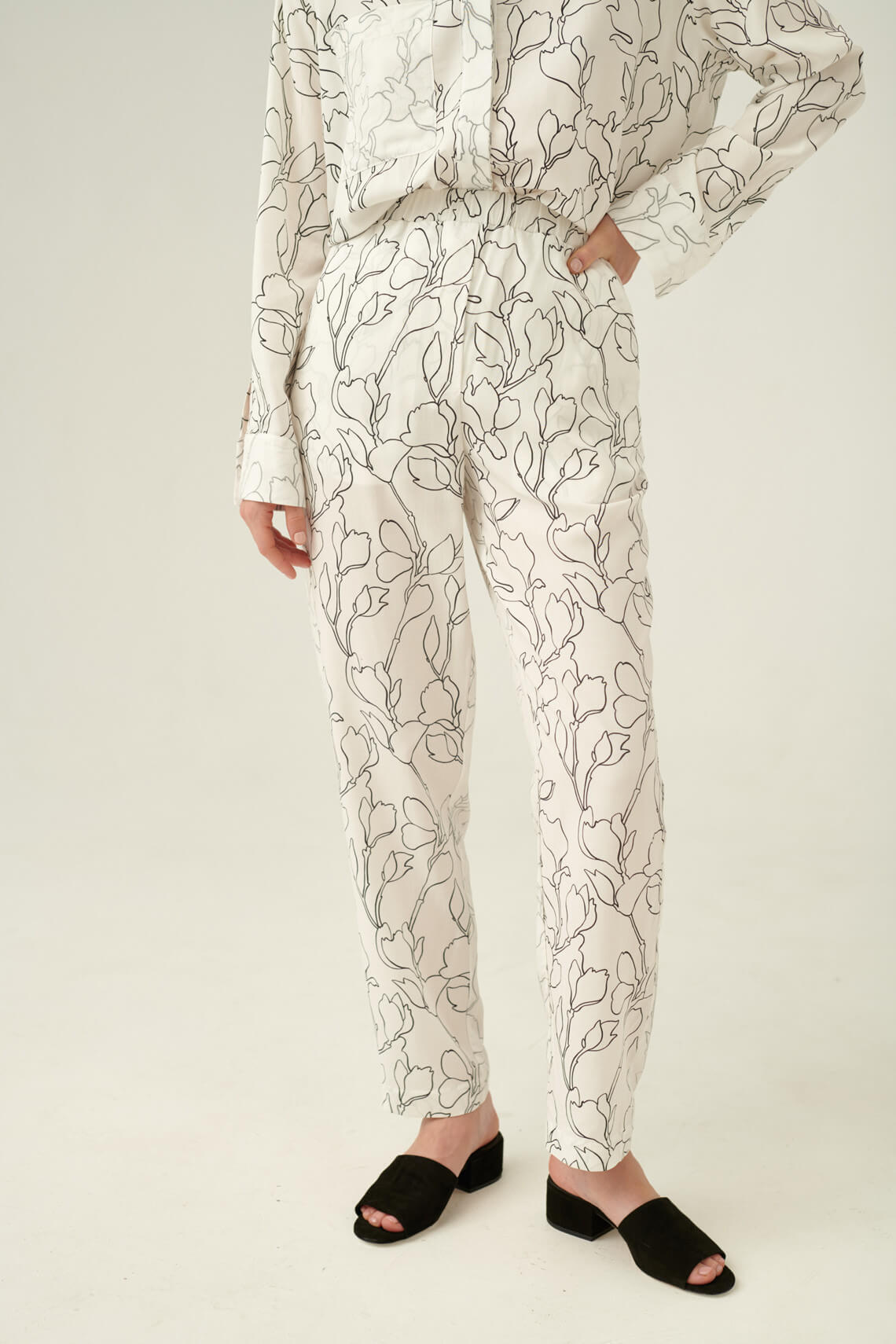 Свободные брюки из нежной вискозы. Посадка высокая, пояс на мягкой резинке. Глубокие боковые карманы. В боковом кармане скрыт небольшой карман для телефона.Брюки изготовлены из тканей компаньонов, благодаря этому создается эффект выгоревших на солнце деталей.